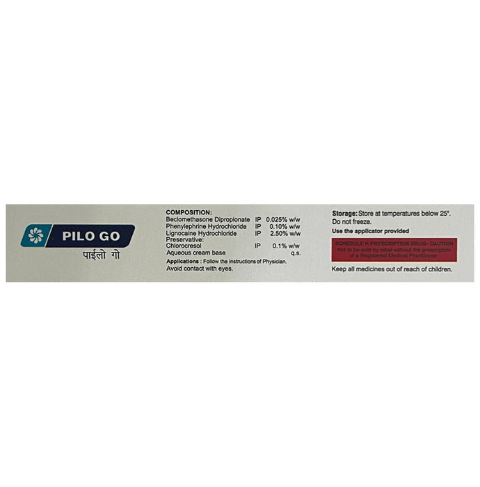 Pilo GO Cream is a combination of three medicines: Phenylephrine, Beclometasone and Lidocaine, which treats piles. Phenylephrine is a decongestant which shrinks the blood vessels in the affected area of skin and decreases swelling. Beclometasone is a steroid which blocks the production of certain chemical messengers (prostaglandins) that make the skin red, swollen and itchy. Lidocaine is a local anesthetic which works by blocking pain signals from the nerves to the brain thereby decreasing pain sensation.