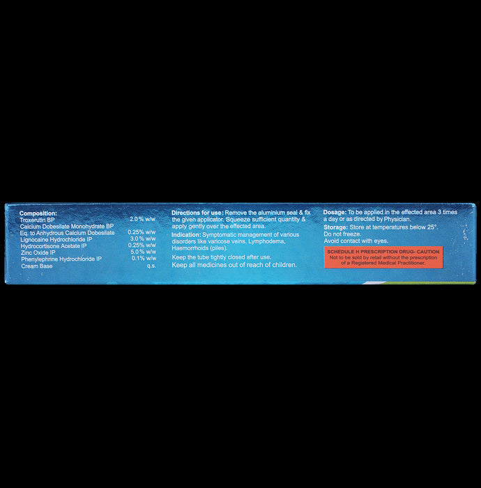 Composition : Lidocaine (3% w/w) + Calcium Dobesilate (0.25% w/w) + Hydrocortisone (0.25% w/w) + Phenylephrine (0.1% w/w) + Zinc Oxide (5% w/w) + Troxerutin (2% w/w)