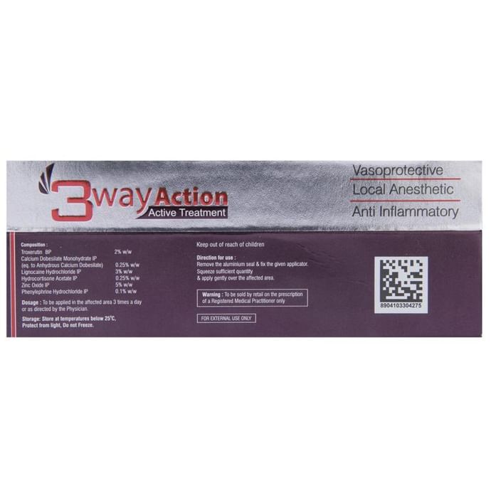 Composition : Lidocaine (3% w/w) + Calcium Dobesilate (0.25% w/w) + Hydrocortisone (0.25% w/w) + Phenylephrine (0.1% w/w) + Zinc Oxide (5% w/w) + Troxerutin (2% w/w)