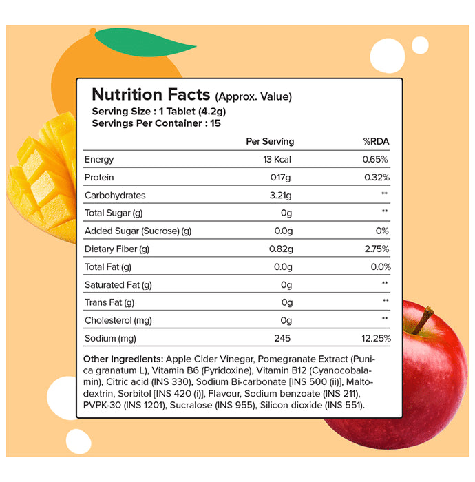 Composition : 500mg ACV with 6% Acetic Acid, Pomegranate, Vitamin B6 (Pyridoxine), Vitamin B12 (Cyanocobalamin), Citric acid (INS330) Sodium Bicarbonate, Maltodextrin, Sorbitol, Sodium Benzoate, Silicon dioxide.