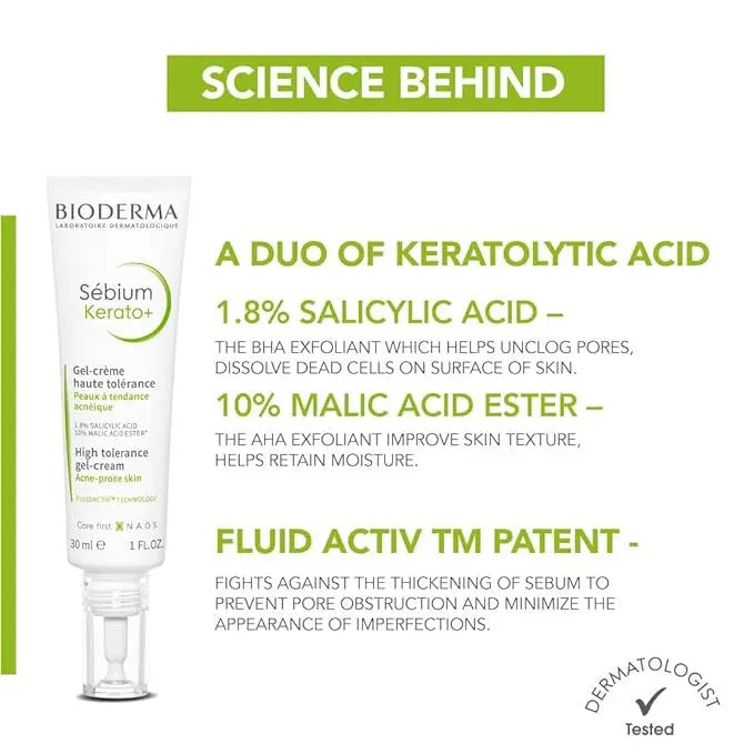 Bioderma Sebium Kerato+ Gel-Cream is an anti-blemish gel cream with visible results in a few days. Anti-blemish eliminates pimples and blackheads reduces existing marks and prevents the formation of new ones. It has a high tolerance,8h hydration, Non-drying formula.