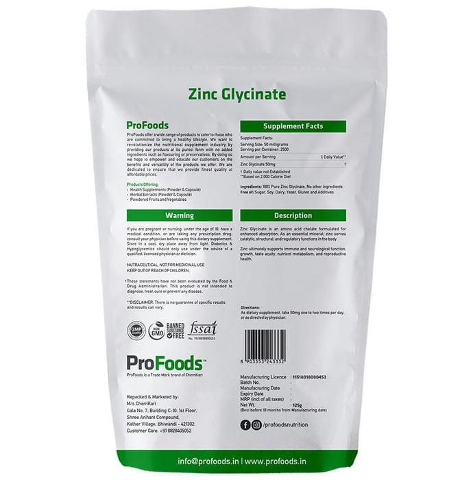 ProFoods Zinc Glycinate Powder contains Zinc Glycinate which is an amino acid chelate formulated for enhanced absorption. Zinc is known to serve catalytic, structural, and regulatory functions in the body. In addition to this, Zinc ultimately supports immune and neurological function, growth, taste acuity, nutrient metabolism, and reproductive health.