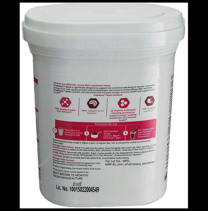 Prohance Mom Nutritional Drink Powder for Pregnant & Lactating Women Chocolate is specifically designed to support the nutritional well-being of women. It provides energy from high-quality proteins and carbohydrates and contains healthy dietary fibre and DHA. The formula contains micronutrients that enhance energy and support bone and immune health.
