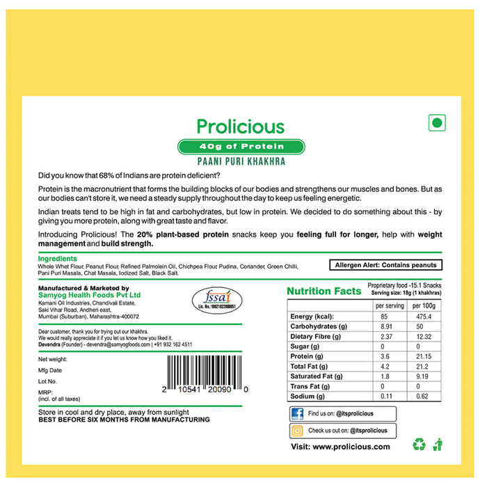Prolicious Paani Puri Khakhra is made using a whole-wheat base with flavourful paani puri masala mixed into the dough, to give you a mouthful of chatpata Pani puri. The pani puri khakhra works well with some mint chutney, dahi or khatti-meethi imli chutney.
