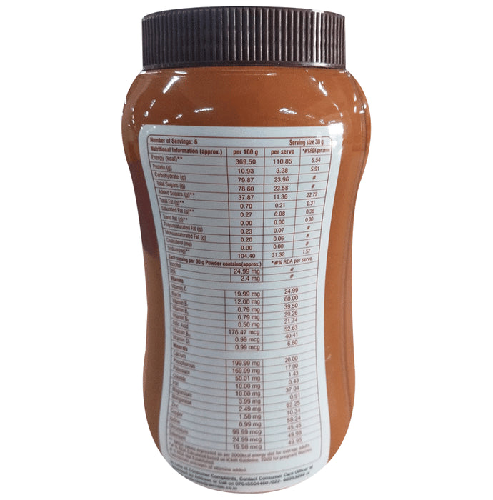 Composition : Cocoa Powder, Sweetener (Sucrose), Whey Protein Concentrate 35% Diluent (Maltodextrin Powder), Ferric Pyrophosphate, Vitamin C (L-Ascorbic Acid), Inositol, Potassium Chloride, Sodium Chloride, DHA (Docosahexaenoic acid) Powder 10%, Manganese Sulphate Monohydrate, Magnesium Oxide, Zinc Sulphate Monohydrate, Copper Sulphate Pentahydrate, Vitamin B2 (Riboflavin Sodium Phosphate), Vitamin B1 (Thiamine Hydrochloride), Vitamin B6 (Pyridoxine Hydrochloride), n-pteroyl-l-glutamic acid, Cyanocobalamin, Potassium Iodide, Chromium Trichloride Heahydrate, Sodium Selenite Anhydrous, Ergocalciferol