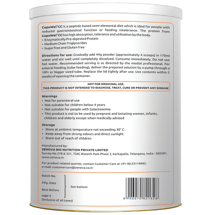 Pulse CopeWel CC Powder Vanilla is ideal for promoting faster absorption. It helps deal with malabsorption and promotes healthy metabolism. is a peptide-based semi-element diet that is ideal for people with reduced gastrointestinal function or feeding intolerance. The protein from Copewel CC Vanilla Flavour Powder has high absorption, tolerance, and utilization by the body. This product is free from sugar and gluten.
