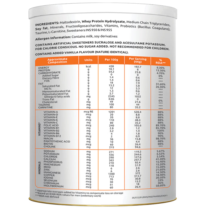 Composition : Maltodextrin, Whey Protein Hydrolysate, Medium Chain Triglycerides, Soy Fat, Minerals, Fructooligosaccharides, Vitamins, Probiotics (Bacillus Coagulans), Taurine, L-Carnitine, Sweeteners INS 950 & INS 955.