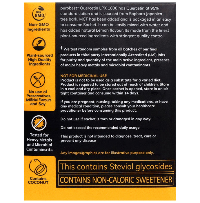 Purobest Quercetin LPX Quercetin LPX 1000 is a unique and highly bioavailable formulation that combines Quercetin 95% extracted from Sophora Japonica tree bark, Bromelain from Pineapple, and MCT (Medium Chain Triglyceride) powder. It comes in an easy-to-consume powder form, packaged in sachets with a refreshing lemon flavour. This product is made from the finest, all-natural ingredients, is 100% vegetarian and is rigorously tested by third-party internationally accredited (IAS) Eurofin labs, ensuring that the main ingredient quantity is accurate and that there are no major heavy metals or microbial contaminants present.