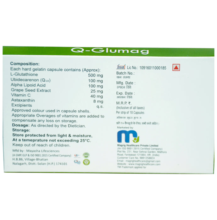 Q-Glumag Capsule contains l-glutathione, ubidecarenone (Q10), alpha lipoid acid, grape seed extract, vitamin C, and astaxanthin can offer a potent antioxidant blend for overall health. It may help in supporting energy production, cognitive function, and immune system.