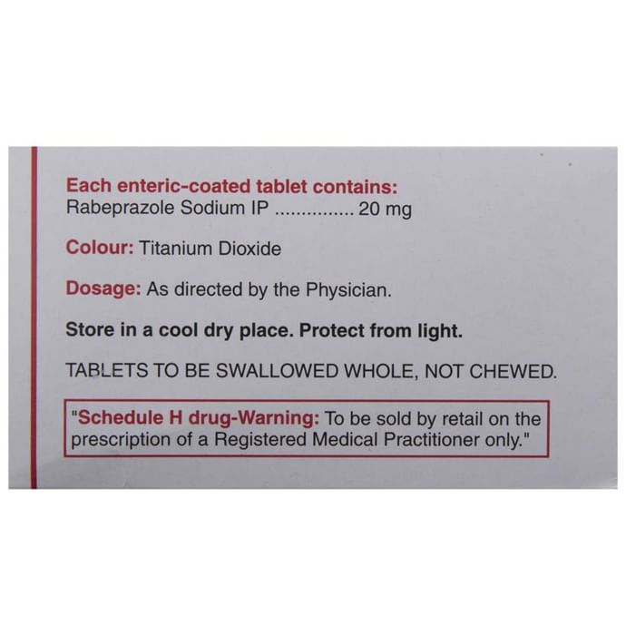 Rabicip 20 Tablet is a medicine that reduces the amount of acid produced in your stomach. It is used in the treatment of acid-related diseases of the stomach and intestine such as acid reflux, peptic ulcer disease, and Zollinger-Ellison syndrome. It provides relief from symptoms and promotes healing. Rabicip 20 Tablet medicine should be taken one hour before a meal, preferably in the morning. The dose will depend on your underlying condition and how you respond to the medicine. Try to take it regularly at the same time each day as advised by your doctor. You should keep on taking it as prescribed even if your symptoms disappear quickly. You may be able to help improve your symptoms by eating smaller meals more often and avoiding caffeinated drinks like tea and coffee, and spicy or fatty foods.This medicine's most common side effects include nausea, vomiting, headache, dizziness, flatulence, diarrhea, and stomach pain. These tend to be mild but talk to your doctor if they bother you or do not go away. The risk of side effects may increase the longer you take this medicine. Long-term use (more than 1 year) may increase your risk for bone fractures, especially with higher doses. Talk to your doctor about ways to prevent bone loss (osteoporosis), like taking calcium and vitamin D supplements.Low blood magnesium levels (hypomagnesemia) have been seen in some people taking this medicine for 3 months or more. This may lead to tiredness, confusion, dizziness, muscle twitches, and an irregular heartbeat. Your doctor may monitor your magnesium levels to prevent this.Rabicip 20 Tablet is not suitable for some people. Before taking this medicine, you need to tell your doctor if you have severe liver problems, are taking medicines for HIV, have ever had an allergic reaction to similar medicines in the past, or suffer from bone loss (osteoporosis). Pregnant or breastfeeding women should also consult their doctor before taking it. Avoid drinking alcohol as it makes your stomach produce excessive acid and can worsen your symptoms. Do not drive or use machinery or tools, if this medicine makes you feel dizzy or sleepy.