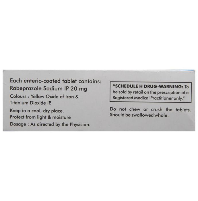 Rabiros 20 Tablet is a medicine that reduces the amount of acid produced in your stomach. It is used in the treatment of acid-related diseases of the stomach and intestine such as acid reflux, peptic ulcer disease, and Zollinger-Ellison syndrome. It provides relief from symptoms and promotes healing. Rabiros 20 Tablet medicine should be taken one hour before a meal, preferably in the morning. The dose will depend on your underlying condition and how you respond to the medicine. Try to take it regularly at the same time each day as advised by your doctor. You should keep on taking it as prescribed even if your symptoms disappear quickly. You may be able to help improve your symptoms by eating smaller meals more often and avoiding caffeinated drinks like tea and coffee, and spicy or fatty foods.This medicine's most common side effects include nausea, vomiting, headache, dizziness, flatulence, diarrhea, and stomach pain. These tend to be mild but talk to your doctor if they bother you or do not go away. The risk of side effects may increase the longer you take this medicine. Long-term use (more than 1 year) may increase your risk for bone fractures, especially with higher doses. Talk to your doctor about ways to prevent bone loss (osteoporosis), like taking calcium and vitamin D supplements.Low blood magnesium levels (hypomagnesemia) have been seen in some people taking this medicine for 3 months or more. This may lead to tiredness, confusion, dizziness, muscle twitches, and an irregular heartbeat. Your doctor may monitor your magnesium levels to prevent this.Rabiros 20 Tablet is not suitable for some people. Before taking this medicine, you need to tell your doctor if you have severe liver problems, are taking medicines for HIV, have ever had an allergic reaction to similar medicines in the past, or suffer from bone loss (osteoporosis). Pregnant or breastfeeding women should also consult their doctor before taking it. Avoid drinking alcohol as it makes your stomach produce excessive acid and can worsen your symptoms. Do not drive or use machinery or tools, if this medicine makes you feel dizzy or sleepy.