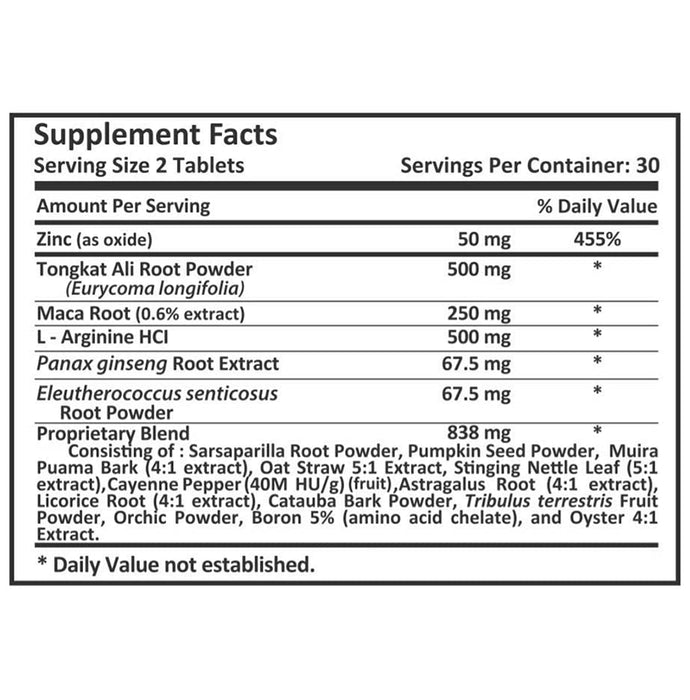 Composition : Zinc (as oxide)|Tongkat ali root powder (Eurycoma longifolia)|Maca root|L-Arginine HCI|Panax ginseng root extract|Eleutherococcus senticosus Root Powder