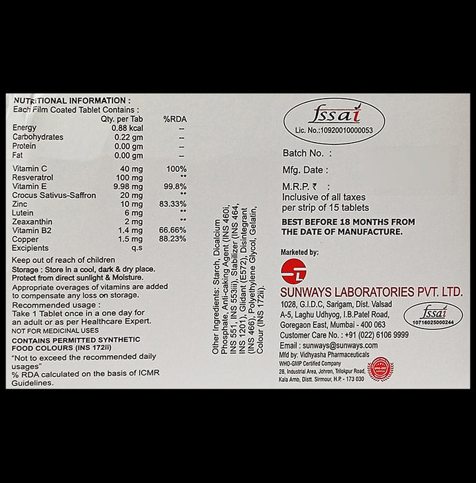 Composition : Vitamin C,Resveratrol,Vitamin E,Crocus Sativus-Saffron,Zinc,Lutein,Zeaxanthin,Vitamin B2,Copper