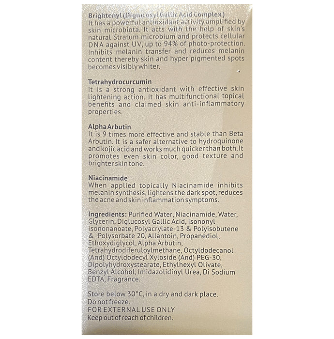 Composition : Purified Water, Glycerin, Diglucosyl Gallic Acid, Niacinamide, Allantoin, Alpha-Arbutin, Tetrahydrocurcumin, Polyacrylate-13, Polyisobutene, Polysorbate 20, Octyldodecanol, Octyldodecyl Xyloside, PEG-30 Dipolyhydroxystearate, Ethylhexyl Olivate, Benzyl Alcohol, Imidazolidinyl Urea, Diethylene Glycol Monoethyl Ether, Disodium EDTA, Propanediol, Fragrance