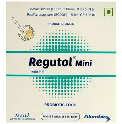 Regutol Mini Probiotic Liquid is designed to aid in the maintenance of probiotic activity in the intestine. It will likely boost immune activity, protect the body from pathogens, and improve gut health. Ingredients: Baillus subtilis|Bacillus coagulans Benefits: It helps to keep probiotic action in the gut active|It aids in the proper functioning of the intestines|It helps restore the natural balance of good and bad bacteria in the gut and promotes its healthier functioning Direction of use: Take 1 capsule daily with milk or water or as directed by the physician. Uses: It may help to maintain gut health|It may improve bowel movement|It can reduce the side effects of antibiotics