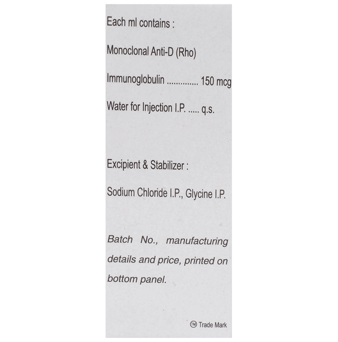Rhoclone 150mcg Injection is indicated to prevent infections. It prevents antibodies from forming after a person with Rh-negative blood receives a transfusion with Rh-positive blood, or during pregnancy when a mother has Rh-negative blood and the baby is Rh-positive. Rhoclone 150mcg Injection is given for Rh prophylaxis in pregnancy-related complications. It is also approved for Incompatible transfusions in Rh-negative individuals transfused with blood components containing Rh-positive red blood cells (RBCs). It may also be used for immune thrombocytopenic purpura, a condition wherein the number of circulating platelets decrease leading to easy bruising.Your doctor or nurse will give you this injection. Kindly do not self administer. The injection is given into a muscle; normally it is given in the upper arm. You will be offered an anti-D injection routinely at 28 weeks of pregnancy and within 72 hours of birth if your baby is Rh D positive.This medicine is genrally safe with no common side effects. However, if you get any symptoms on receiving the injection, you should tell your doctor. There may be ways of preventing or reducing these symptoms.Before using it, you should tell your doctor if you have any problems with blood clotting and if you have recently had, or plan to have, a vaccination.
