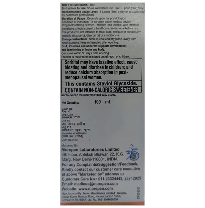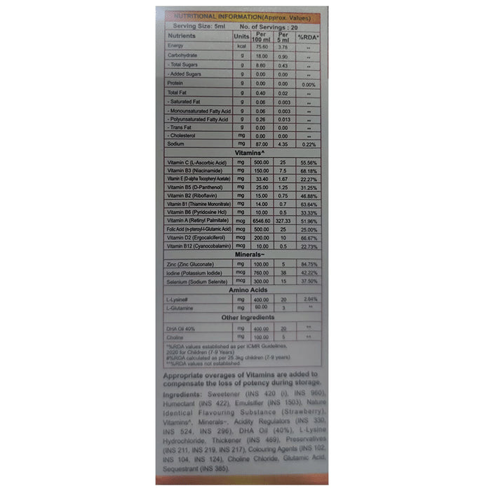 Composition : Vitamins:C (L-Ascorbic Acid), B3 (Niacinamide), E (D-alpha Tocopheryl Acatate), B5 (D-Panthenol), B2 (Riboflavin), B1 (Thiamine Mononitrate), B6 (Pyridoxine Hel), A (Retinyl Palmitate), Folic Acid to pleroy-Glutamic Acid, D2 (Ergocalciferol), B12 (Cyanocobalamin),Minerals:Zinc (Zing Gluconate), Iodine (Potassium iodide), Selenium (Sodium Selenate),Amoni Acid:L-Lysines and L-Glutamine,Other ingredients:DHA Oil 40% and Choline,Ingredients:Sweetener (INS 420 (i), INS 960) Humectant (INS 422). Emuisher (INS 1503), Nake Identical Flavouring Substance (Strawberry) Vitamins Minerals, Ackity Regalos GNS INS 624, INS 296), DHA ON (40%), L-Lysine Hydrochloride. Thickener (INS 459) Prosorvalive INS 211, INS 219 INS 217), Colouring Agents (INS 102 INS 104 INS 174), Choline Chixide, Glutarc Ad Sequenrant (INS 385)