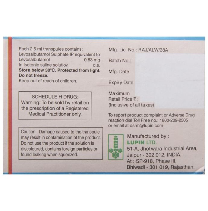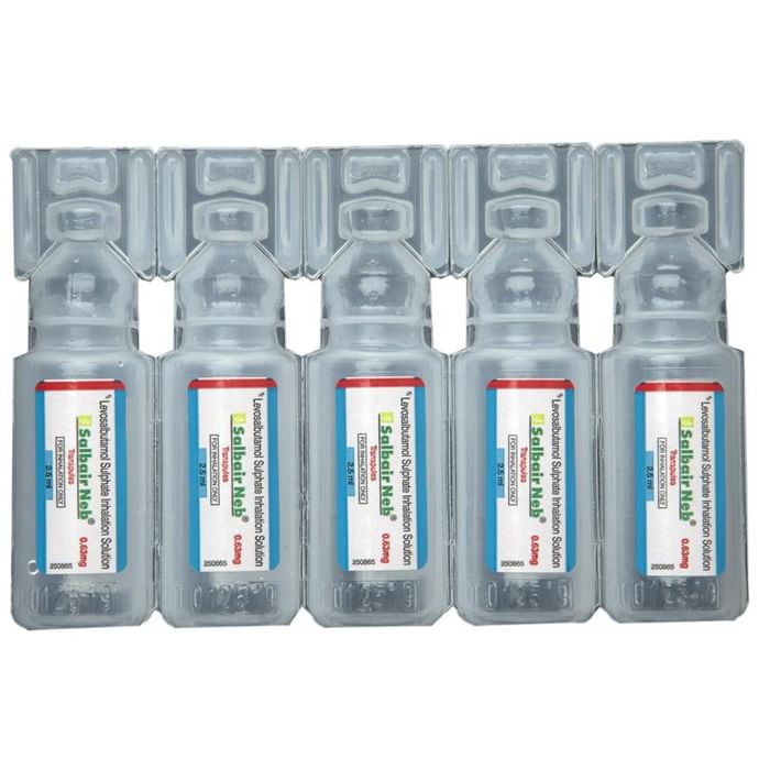 Salbair Neb 0.63 Transpules is a belongs to a group of medicines called fast-acting bronchodilators or relievers. It is used to treat the symptoms of asthma and chronic obstructive pulmonary disease (COPD) such as coughing, wheezing, and feeling short of breath. Salbair Neb 0.63 Transpules gives quick relief from breathing problems when you need it. In most cases, you will be given another inhaler to prevent your symptoms (a preventer) to u with this. This medicine works quickly and the effects can last several hours. You can take it at any time of day, but only use it when you notice symptoms, such as coughing, wheezing, shortness of breath, and tightness in the chest or you know that you are going to do an activity that can make you breathless. When an asthma attack happens, you should take the number of puffs your doctor recommends. There are several types of inhaler devices so make sure you know how to use your inhaler correctly, otherwise, it may not work. Do not stop using this medicine unless your doctor tells you to. If you stop, your breathing problems could get worse.Common side effects of this medicine include accidental injury, bronchitis, dizziness, pain, pharyngitis, nasal congestion, vomiting, tremors, palpitations, chest pain, and sore throat. These side effects are not often dangerous and they should gradually improve as your body gets used to this medicine. There are other, rarer, side effects and you should call your doctor straight away if you get chest pain, a very bad headache, or very bad dizziness.Before using Salbair Neb 0.63 Transpules, you should tell your doctor if you have high blood pressure, an overactive thyroid gland, a history of heart problems, diabetes, or low levels of potassium in your blood to make sure it is safe. Also, make sure your doctor knows if you are pregnant or breastfeeding before taking this medicine. Because this medicine can make you feel dizzy or shaky, do not drive, cycle, or use tools or machinery until you feel better. You should not smoke as it causes damage to your lungs and will make your condition worse.