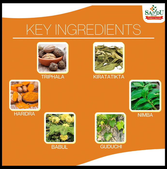 Composition : Triphala,Kiratatikta (Swertia chirata),Haridra (Curcuma longa),Neem (Azadirachta indica),Shunthi (Zingiber officinale)