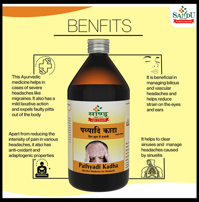 Sandu Pathyadi Kadha is one of the most effective medicines for headaches, especially migraines. It is beneficial for vascular headaches, headaches caused by eye strain, earache, eye pain, and eye disorders with inflammation and vision disturbances.