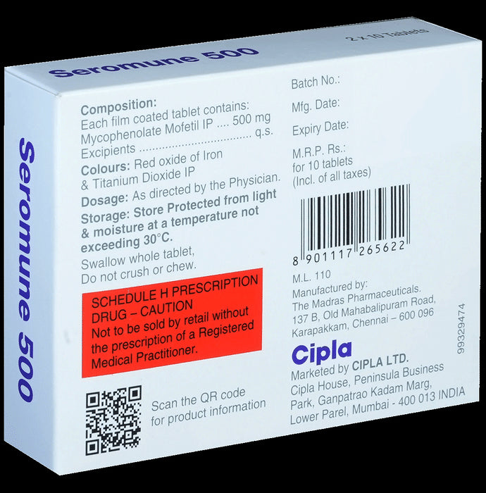 Seromune 500 Tablet belongs to a group of medicines called immunosuppressants. It is used with other medicines to prevent your body from rejecting an organ (such as a kidney, heart, or liver) after a transplant. It works by suppressing your body’s immune system so that it does not attack the new organ. The amount of Seromune 500 Tablet you take and how often you take it depends on the type of transplant you have. Follow your doctor’s instructions on this. Take it on an empty stomach, at least 1 hour before or 2 hours after a meal, unless your doctor suggest otherwise. Swallow it as a whole, do not crush, chew, or break it. Take the medicine regularly to get maximum benefit and keep taking it even when you feel well. The treatment will continue for as long as you need it to prevent rejection. The most common side effects of this medicine include nausea, vomiting, diarrhea, stomach pain, headache, high blood pressure, infections (viral, fungal, bacterial), and changes in the number of white blood cells amongst others. You may catch more infections than usual as medicine suppresses the immune system. There is also an increased risk of developing some cancers for this reason. To reduce your risk of skin cancer, limit your exposure to the sun and use sunscreen. There is a long list of potential side effects of this medicine. You should ask your doctor about them and what signs to look out for because some of them can be serious and need urgent medical attention.Seromune 500 Tablet can cause birth defects and abortion so do not take it if you are pregnant, planning to become pregnant, or breastfeeding. You should talk to your doctor before taking this medicine if you have any signs of infection or if you have any unexpected bruising or bleeding. You should also let your healthcare team know all other medicines you are taking as they may affect, or be affected by, this medicine. You will have regular tests to check for any changes in the number of your blood cells and the amount of sugar and cholesterol in your blood.