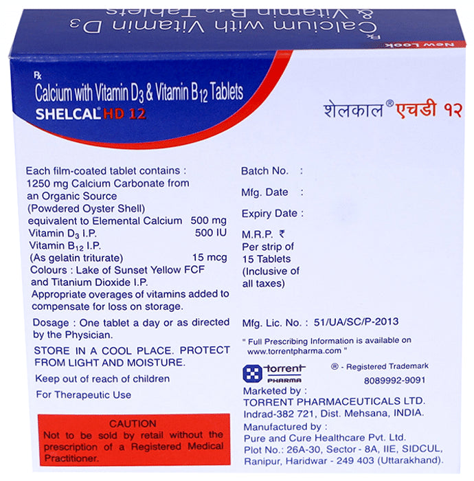 Shelcal -HD 12 Tablet is a dietary supplement formulated with calcium, vitamin B12 and vitamin D3 that promotes bone and joint health. It helps in muscle contraction, muscle building and flexibility of joints. It may help improve bone health and lower osteoporosis risk.