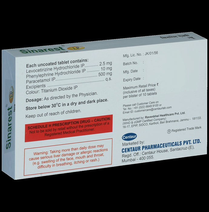 Sinarest LP New Tablet is used in the treatment of common cold symptoms like runny nose, stuffy nose, sneezing, watery eyes, and congestion or stuffiness. It is also used to relieve pain and fever. Sinarest LP New Tablet is taken with or without food in a dose and duration as advised by the doctor. The dose you are given will depend on your condition and how you respond to the medicine. You should keep taking this medicine for as long as your doctor recommends. If you stop treatment too early your symptoms may come back and your condition may worsen. Let your healthcare team know about all other medications you are taking as some may affect, or be affected by this medicine.The most common side effects are nausea, vomiting, weakness, headache, dryness in the mouth and allergic reaction. Most of these are temporary and usually resolve with time. Contact your doctor straight away if you are at all concerned about any of these side effects. This medicine can also cause sleepiness, so do not drive or do anything that requires mental focus until you know how this medicine affects you. Avoid drinking alcohol while taking this medicine as it can worsen your sleepiness.Never support self-medication or recommend your medicine to another person. It is beneficial to have plenty of fluids while taking this medication. Before taking this medicine, you should tell your doctor if you have any kidney or liver diseases so that your doctor can prescribe a suitable dose for you. You should also tell your doctor if you are pregnant, planning pregnancy or breastfeeding.