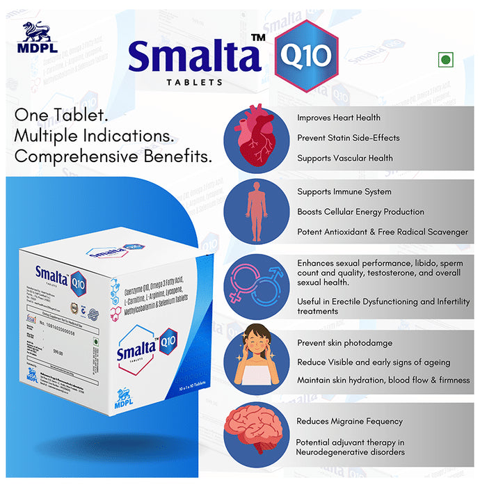 Smalta Q10 Tablets are formulated to deliver potent and efficient absorption, coupled with an array of advantages such as invigorating vitality and bolstering overall health. Enriched with coenzymeq10, a potent super antioxidant, it promotes a healthy cardiovascular system, helps combat hypertension, mitigate ageing, relieve fatigue, enhance dental and dermatological health and preserve visual acuity. It also helps sustain renal function, alleviate migraines, improve neural and cognitive health, and supports male sexual health. Other vital ingredients, including lycopene, l-carnitine, l-arginine, omega-3 fatty acids, and selenium, synergistically contribute to maintaining optimal well-being.