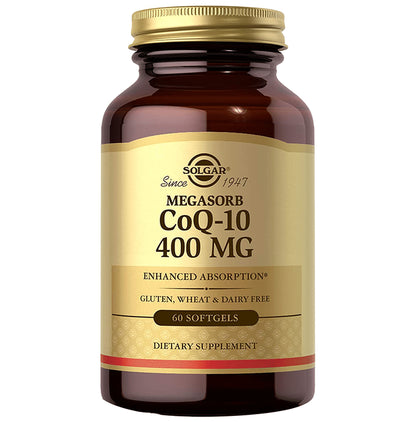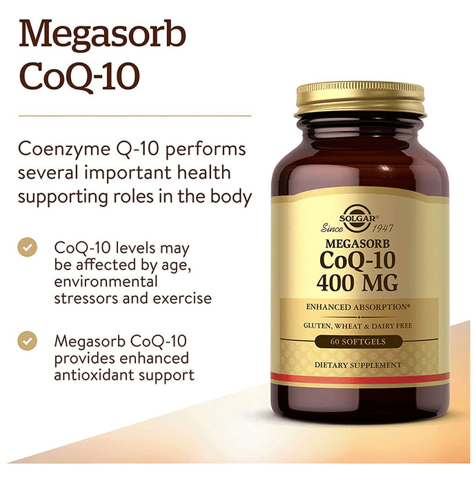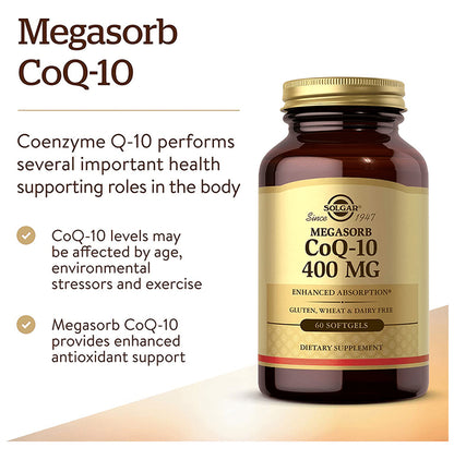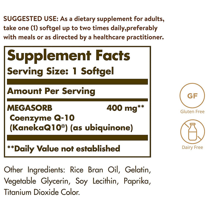 Solgar Megasorb coq 10 400 mg Softgel is a dietary supplement that supports heart and brain function. It contains 400 mg of Coenzyme Q10 per soft gel, a fat-soluble antioxidant that helps fight cell-damaging free radicals in the body, promoting heart and nervous system health. The formula is enhanced with Kaneka Q10 for optimal absorption, and each bottle contains 60 gluten-free, wheat-free, and dairy-free soft gels.