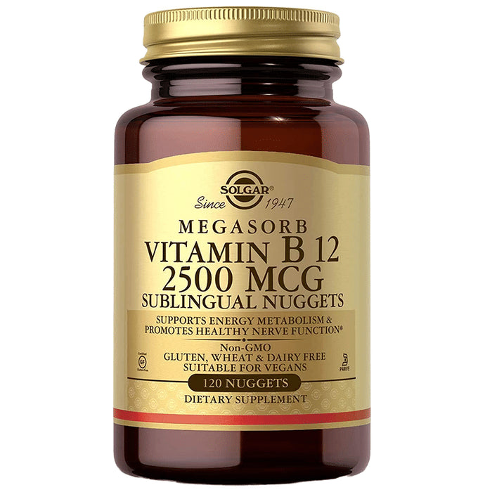Solgar Megasorb Vitamin B12 Sublingual Nuggetsis a dietary supplement that can help convert food into cellular energy. It contains folic acid and vitamin B6 that supports heart health by promoting healthy homocysteine levels. It is involved in DNA synthesis and renewal and contains vitamin B12, which helps in proper red blood cell formation and normal function of the nervous system.