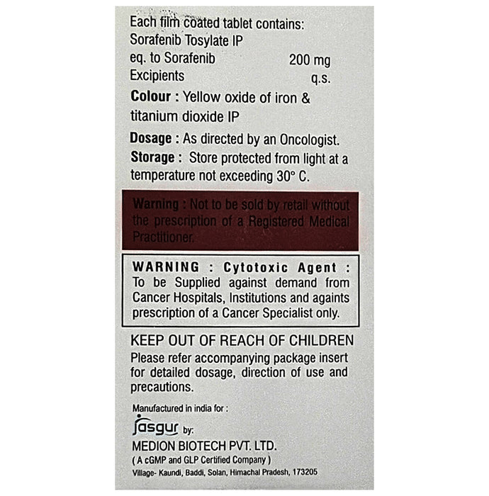 Sorabuzz Tablet belongs to the class of medicines known as tyrosine kinase inhibitors used in the treatment of liver cancer, kidney cancer, and thyroid cancer. Sorabuzz Tablet should be taken on an empty stomach, but try to have it at the same time every day to get the most benefits. Your doctor will decide what dose is necessary and how often you need to take it. This will depend on what you are being treated for and may change from time to time. You should take it exactly as your doctor has advised. Taking it in the wrong way or taking too much can cause very serious side effects. It may take several weeks or months for you to see or feel the benefits but do not stop taking it unless your doctor tells you to.Fatigue, nausea, loss of appetite, hair loss and diarrhea are some common side effects of this medicine. It might cause high blood pressure, so the doctor may ask you for a regular check-up of blood pressure. You must inform your doctor if you notice severe skin reaction such as skin rash, or any pain, swelling, and redness of your hands and feet.Before taking it, tell your doctor if you have heart disease, liver, or kidney problems or high blood pressure. Many other medicines can affect, or be affected by, this medicine so let your healthcare team know all medications you are using. This medicine is not recommended during pregnancy or while breastfeeding. The use of effective contraception by both males and females during treatment is important to avoid pregnancy.