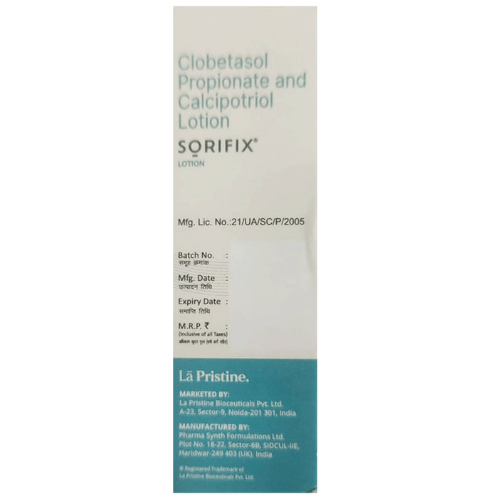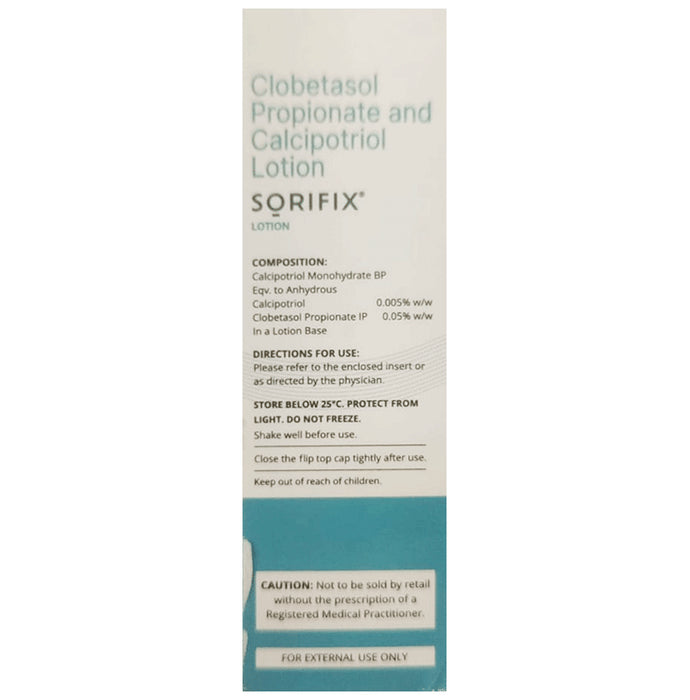 Sorifix Lotion is a prescription medicine having a combination of medicines that are used to treat psoriasis. It provides relief from redness, itching, and swelling. It removes the dead skin cells and helps in softening the skin. Sorifix Lotion should be used in the dose and duration as advised by your doctor. Wash your hands before using this medicine. It is advised to check the label for directions before use. It is for external use only.Do not use this medicine more than the recommended dose. Inform your doctor if you have known allergies to this medicine. The common side effects of this medicine include itching and rashes at the application site. If these side effects or any other symptoms which you think are because of this medicine persist for a longer duration, please consult your doctor. Inform your doctor if you are pregnant or are suffering from any other disease. This medicine is safe to use in breastfeeding mothers.