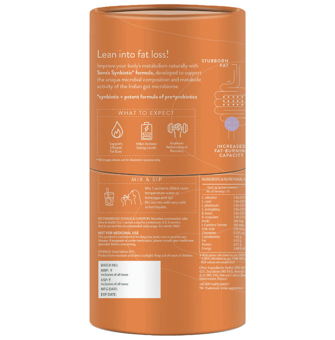 Sova's Metabolic Fuel is a dietary supplement with 30 billion CFU that provides fat-burn support. Improve your body's metabolism and fat-burning capacity naturally with its synbiotic formula, developed to support the unique microbial composition and metabolic activity of the Indian gut microbiome. This supplement is formulated to be effective and is vegan, non-GMO, sugar-free and preservatives free.