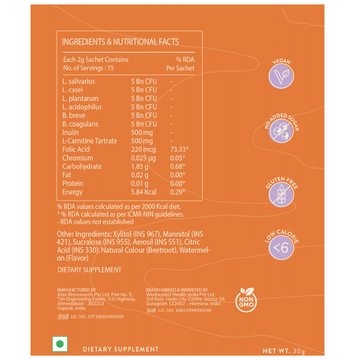 Composition : L. salivarius 5Bn CFU,L. casei 5Bn CFU,L. plantarum 5Bn CFU,L. acidophilus 5Bn CFU,B. breve 5Bn CFU,B.coagulans 5Bn CFU,Inulin 500mg,L-Carnitine Tartrate 500mg,Folic acid 220mcg,Chromium 0.025,Watermelon (flavour)