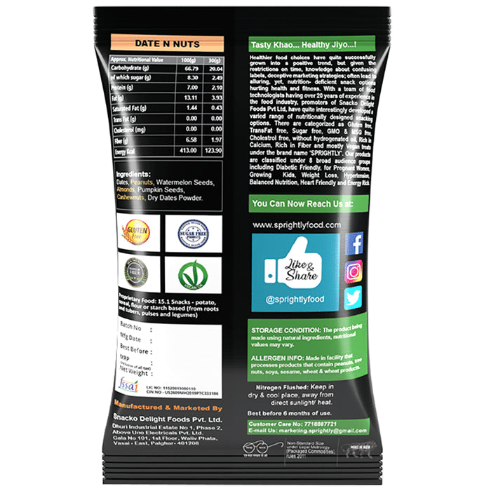 Sprightly Date N Nuts Super Food Bar is a delicious, gluten-free, 100% vegan protein bar. It provides protein and energy to the body. It contains dates that are high in antioxidants and fibre to keep you full for longer. Peanuts are rich in protein, fibre and good fats which may help to reduce cholesterol levels in the body. These bars are a rich source of micronutrients such as magnesium, zinc, omega 3 and omega 6 fatty acids, copper and potassium.