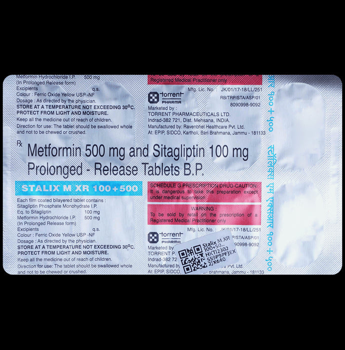 Stalix M XR 100+500 Tablet is a combination of two medicines that control high blood sugar levels in people with type 2 diabetes mellitus. This helps prevent serious complications of diabetes, such as kidney damage and blindness and may reduce your chances of having a heart attack or stroke. Stalix M XR 100+500 Tablet may be prescribed alone or along with other diabetes medications. It works best when used along with a healthy diet and regular exercise. Your dose will depend on your condition, blood sugar levels, and other medicines you are taking. Taking it with meals helps to reduce the chances of developing an upset stomach.To get the most benefit, you should take it regularly, at the same time each day, and you should not stop unless your doctor recommends it. It is important to stay on the diet and exercise program recommended by your doctor while taking this medicine. Your lifestyle plays a big part in controlling diabetes.The most common side effects of taking Stalix M XR 100+500 Tablet include diarrhea, upper respiratory tract infection, and headache. Low blood sugar level (hypoglycemia) is a possible side effect if you are also taking other diabetes medicines like insulin or sulfonylurea. Hence, you need to know how to recognize and deal with it.This medicine is not suitable for everyone. Before taking it, you should let your doctor know if you have ever had kidney, liver, or heart disease, problems with your pancreas, or if you drink a lot of alcohol. Pregnant or breastfeeding women should also consult their doctor before taking this medicine. Some other medicines may affect Stalix M XR 100+500 Tablet, so tell your doctor about all the other medicines you are taking to ensure you are safe. You should try to avoid drinking alcohol as it lowers blood glucose. Your doctor will check your kidney function and blood sugar levels before and during treatment.