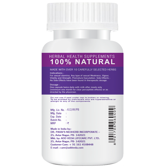 Stemno Capsule is a complete male health capsule or the perfect manpower booster. It helps improve semen parameters by quality and quantity i.e. it significantly increases sperm count, sperm motility and the volume of semen.Stemno Capsule contains Shilajit (Asphaltum), Rumi Mastaki (Pistacia Terebinthus), Konch Beej (Mucuna Prurita), Shudh Kuchla (Strychnous Nux Vomica), Aswagandha (Withania Somnifera), Mal Kangni (Celastrus Peniculatus), Dhatura Beej (Dhatura Alba), Khurasani Ajwain (Hyoscyamus Niger), Safed Musli (Asparagus Adscendens), Kali Musli (Curculigo Orchioides), Kesar (Crocus Sativus), Loh Bhasma (Ferum Calcinied), Jisat Bhasma (Zinc Calcinied), Silver Bhasma (Silver Calcinied), Akarkara (Anacyclus Pyrethrum), Abrak Bhasma (Mica Calcined), Salam Mishri (Orchis Latifolia), and Makardwaj (Red Sulphide of Mercury). Benefits of Stemno Capsule:Strengthens erectile power due to pro-erectile aphrodisiac propertyImproves ejaculatory latencyEnhances sexual vigour, increases libido and helps relieve fatigue and anxiety neurosisPromotes sexual satisfaction and confidenceBuilds up body immunity due to Shilajeet, also called Tridosh controllerAlso tones up nervous, respiratory, renal and circulatory systemImproves resistance of the body Direction for use:Two capsules at bedtime with luke warm milk or one capsule twice a day with milk or fruit juice after meals. Use under medical supervision