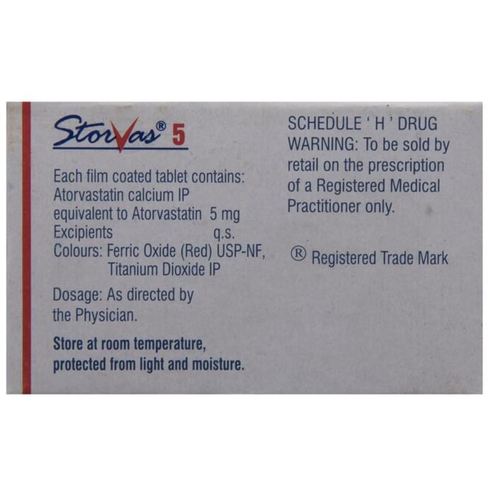 Storvas 5 Tablet belongs to a group of medicines called statins. It is used to lower cholesterol and to reduce the risk of heart diseases. Cholesterol is a fatty substance that builds up in your blood vessels and causes narrowing, which may lead to a heart attack or stroke. Storvas 5 Tablet is a widely prescribed medicine and is regarded as safe for long-term use when taken as per the doctor's advice. It can be taken with a meal or on an empty stomach. You can take it at any time of the day but try to take it at about the same time each day. Most people with high cholesterol do not feel ill, but stopping your medicine may increase your cholesterol levels thereby increasing your risk of heart disease and stroke.It is important to have your cholesterol levels checked regularly. This medicine is only one part of the treatment program which should also include a healthy diet, regular exercise, smoking cessation, moderation of alcohol intake, and weight reduction. You can eat normally while taking this medicine, but try to avoid foods that are high in fat. Common side effects of this medicine include constipation, flatulence, dyspepsia, and abdominal pain. These are usually mild and disappear after a short time. Consult your doctor if they persist or if you notice any yellowing of your eyes or get repeated or unexplained muscle pains. This medicine should not be used in some conditions such as liver disease. Also, pregnant women and breastfeeding mothers should not take this medicine as it may harm the developing baby. Diabetic patients should monitor their blood sugar levels while taking this medicine, as it may lead to an increase in blood sugar levels. Your doctor may check your liver function before starting the treatment and monitor it regularly thereafter.
