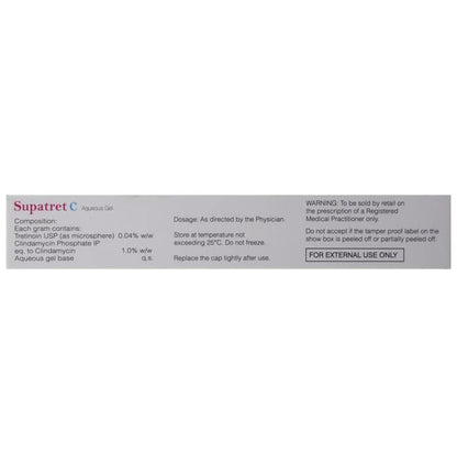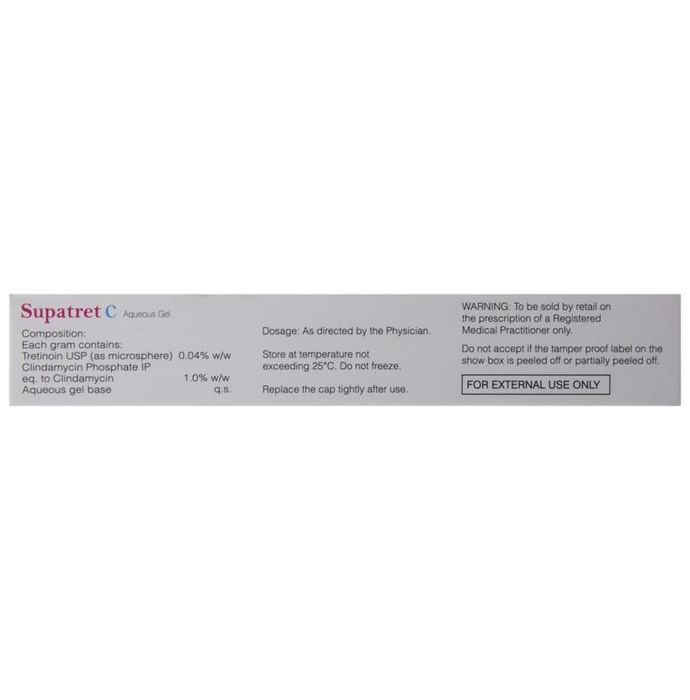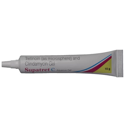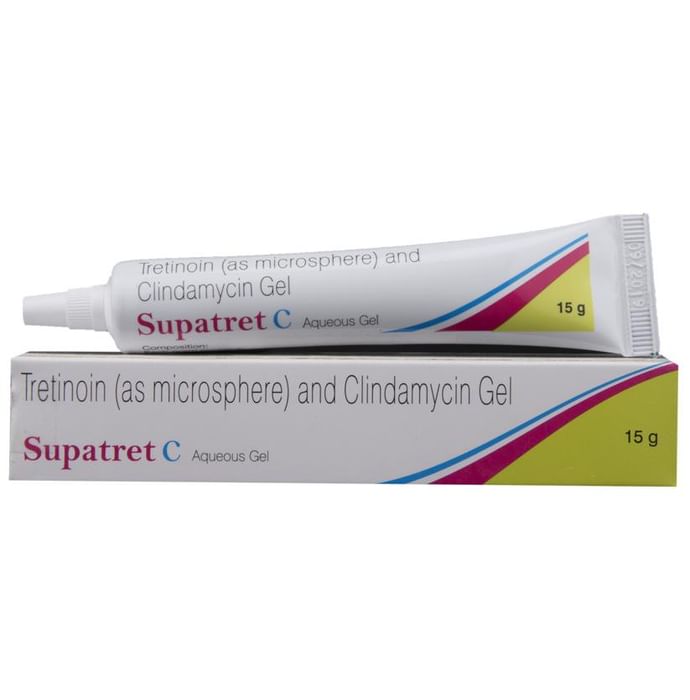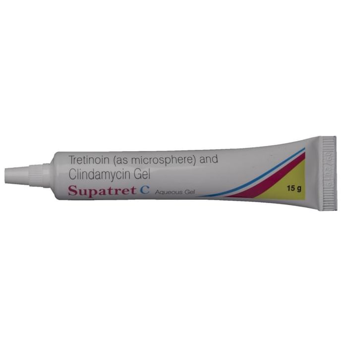 Supatret C Aqueous Gel is a combination of two medicines: Clindamycin and Tretinoin, which treats pimples (acne). Clindamycin is an antibiotic which works by penetrating into the skin and killing acne-causing bacteria. Tretinoin is a form of vitamin A which reduces oil production in the skin, replenishes the skin and helps keep your pores open.
