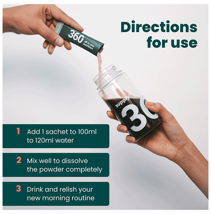 Supply6 360 Sachet is a distinct blend of 63+ vitamins, minerals, adaptogens, probiotics, fruits and greens that strengthen the foundation of your daily health. It is a vegan, GMO-free, GMP-certified formula. It is free from sugar, colours, preservatives, fillers, and sweeteners. It improves gut health and bone strength, aids in digestion, and boosts energy and metabolism.