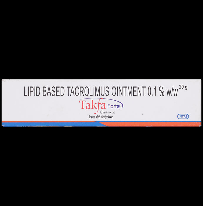 Takfa Forte Ointment is used to treat eczema (atopic dermatitis). It works by suppressing the activity of certain immune cells that cause inflammation (redness and swelling) of the skin. This relieves itching and improves rashes in atopic dermatitis.Takfa Forte Ointment is used for external use. It should be used 2-4 times a day on the affected area or use it as suggested by the doctor. It should be applied slowly and evenly to the skin until it is rubbed in. You should not use it too often and you should not cover the treated area with a bandage or plaster. You must inform your doctor if there’s no improvement even after two weeks of treatment or if the skin gets worse.Use of this medicine may cause some common side effects like erythema, headache, inflammation of hair follicle, and application site reaction like burning, irritation, itching, and redness. This medicine is not normally recommended during pregnancy or while breastfeeding unless it is clearly needed.