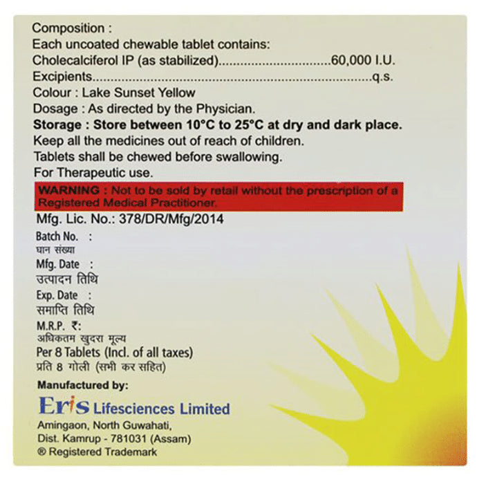 Tayo 60K Cholecalciferol Tablet | Flavour Orange is used to treat vitamin D deficiency and osteoporosis. It helps the body absorb calcium, which is essential for maintaining strong and healthy bones. It is used when the diet does not provide enough. Tayo 60K Cholecalciferol Tablet | Flavour Orange should be taken as directed by your doctor. It is best taken with or after food as this helps your body absorb it, and you should take it regularly to get the most benefit. If you are using it to treat osteoporosis, you will also be prescribed other medicines. This medicine may be only part of a complete treatment program that includes making changes to your diet and taking calcium and vitamin supplements. Learn about the foods you should eat to ensure you get enough calcium and vitamin D.Tayo 60K Cholecalciferol Tablet | Flavour Orange has few side effects, and none are common. If you take too much, you may feel weakness, muscle pain, or a metallic taste in your mouth. If you experience any such side effects, speak with your doctor. They may be able to help you reduce or treat the symptoms.Before taking this medicine, tell your doctor if you have high calcium levels in your blood or if you have any heart, kidney, or liver disease. Some other medicines can decrease the absorption of vitamin D3, so let your doctor know all other medicines you are taking to make sure you are safe. This medicine may help during pregnancy when your body needs more vitamin D, but too much could harm your baby. Discuss with your doctor.