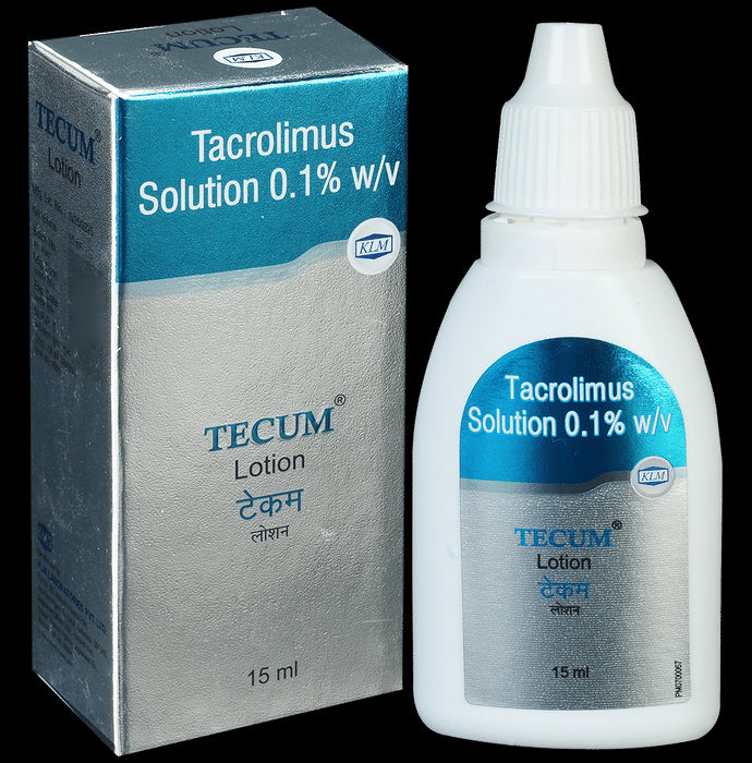 Tecum 0.1% Lotion is used to treat eczema (atopic dermatitis). It works by suppressing the activity of certain immune cells that cause inflammation (redness and swelling) of the skin. This relieves itching and improves rashes in atopic dermatitis.Tecum 0.1% Lotion is used for external use. It should be used 2-4 times a day on the affected area or use it as suggested by the doctor. It should be applied slowly and evenly to the skin until it is rubbed in. You should not use it too often and you should not cover the treated area with a bandage or plaster. You must inform your doctor if there’s no improvement even after two weeks of treatment or if the skin gets worse.Use of this medicine may cause some common side effects like erythema, headache, inflammation of hair follicle, and application site reaction like burning, irritation, itching, and redness. This medicine is not normally recommended during pregnancy or while breastfeeding unless it is clearly needed.