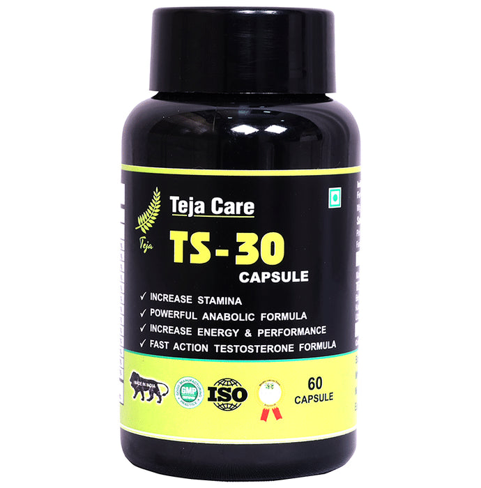 Teja Care TS 30 Capsule Teja Care TS-30 is a blend of herbal extracts and contains potent ingredients that help support the wellness of men’s reproductive system. It helps boost the energy levels and improves stamina. This formula supports muscle strength and optimises physical performance. It manages blood circulation and enhances vigour and vitality.