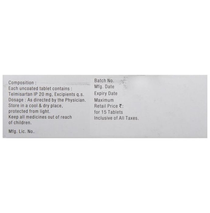 Telsar 20 Tablet is a medicine used to treat high blood pressure and heart failure. Lowering blood pressure helps to prevent future heart attacks and strokes. This medicine is also effective in preserving kidney function in patients with diabetes. Telsar 20 Tablet can be prescribed either alone or in combination with other medicines. It may be taken with or without food during the day or at night. However, try to take it at the same time each day to get the most benefit. It is important to continue taking it regularly even if you feel well or if your blood pressure is controlled. Most people with high blood pressure do not feel ill, but if you stop taking this medicine, your condition could get worse. This is a widely used medicine and is considered safe for long-term use.Making some changes in your lifestyle will also help lower your blood pressure. These may include regular exercise, losing weight, smoking cessation, reducing alcohol intake, and reducing the amount of salt in your diet as advised by your doctor.This medicine is tolerated well by most patients and has few side effects. However, it may cause hypotension (low blood pressure) in some people. Let your doctor know if you experience any of these side effects. They may be able to help by reducing the dosage or by prescribing you an alternate medicine.Before taking this medicine, let your doctor know if you have any kidney or liver problems. Pregnant or breastfeeding mothers should also consult their doctor before taking it. Your doctor may check your kidney function, blood pressure, and potassium levels in your blood at regular intervals while you are taking this medicine.
