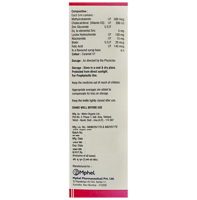 Composition : Methylcobalamin,Cholecalciferol (Vitamin D3),Zinc Gluconate Eq. to elemental Zinc,Lysine Hydrochloride,Niacinamide,Biotin,Folic Acid