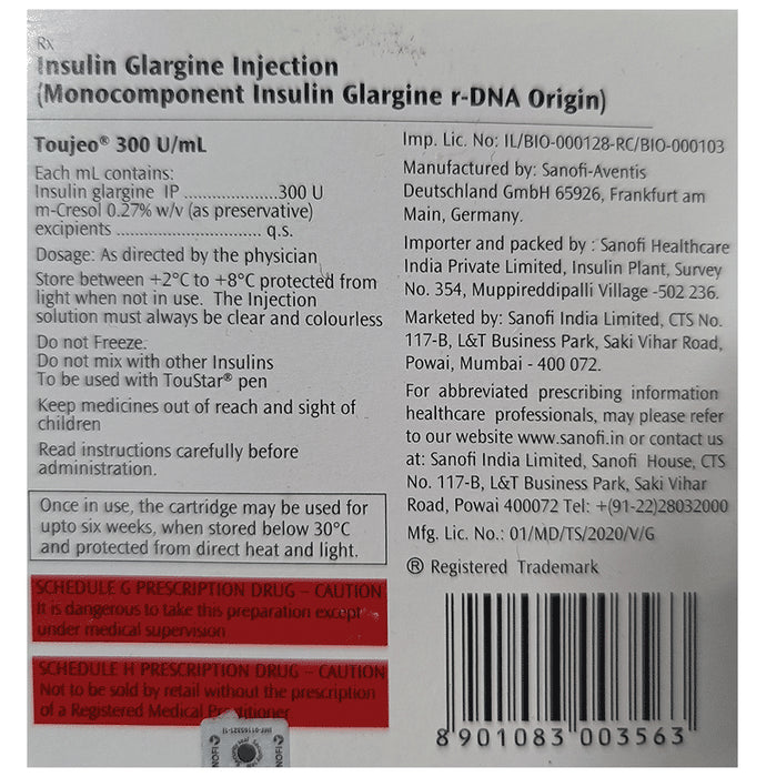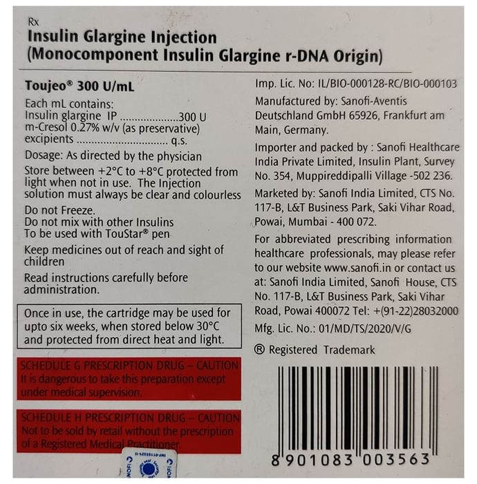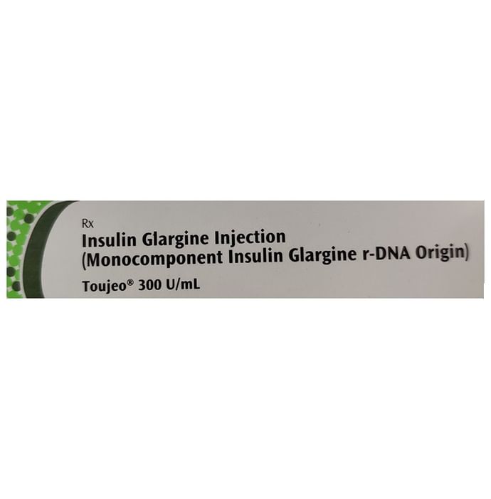 Toujeo 300U/ml Cartridge (1.5ml Each) is a long-acting type of insulin used to treat types 1 and 2 diabetes mellitus in both adults and children. It provides a steady level of insulin in the body for an entire day and helps control blood sugar levels. This helps to prevent complications of diabetes.Toujeo 300U/ml Cartridge (1.5ml Each) can be prescribed alone or along with fast-acting insulin or other diabetes medicines. Your doctor or nurse will teach you the correct way of injecting it under the skin. You should use this medicine regularly as per the dose advised to get the maximum benefit. If you stop taking it, your blood sugar levels may rise very high which may put you at risk of serious complications. It is only a part of the treatment program that should also include a healthy diet, regular exercise and weight reduction as advised by your doctor.The most common side effect of this medicine is low blood sugar levels (hypoglycemia). To prevent this, it is important to inject only the correct dose of medicine, have regular meals, and monitor your blood sugar levels regularly. Drinking excessive alcohol can also lead to a fall in your blood sugar levels. Other common side effects include peripheral edema, lipodystrophy, allergic reactions, injection site reactions, irching, rashes, and weight gain.Do not use this medicine when you have low blood sugar levels. Before starting the treatment, inform your doctor if you have ever had kidney, liver or heart problems. Pregnant or breastfeeding women should consult their doctor before using it.