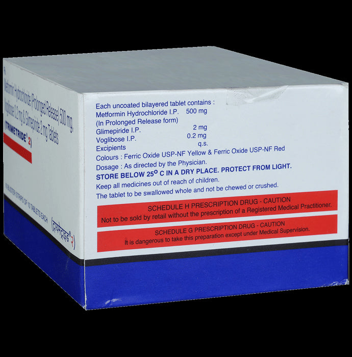 Trimetride 2 Tablet PR belongs to a category of medicines known as anti-diabetic drugs. It is a combination of medicines used to treat type 2 diabetes mellitus in adults. It helps control blood sugar levels in people with diabetes. Trimetride 2 Tablet PR should be taken with food. Take it regularly at the same time each day to get the most benefit. Your doctor will decide what dose is best for you and this may change from time to time according to how it is working according to your blood sugar levels.Keep taking this medicine, even if you feel well or your blood sugar levels are controlled. If you stop it without consulting your doctor, your blood sugar levels could rise and put you at risk of kidney damage, blindness, nerve problems and loss of limbs. Remember that it is only part of a treatment program that should also include a healthy diet, regular exercise, and weight reduction as advised by your doctor. Your lifestyle plays a big part in controlling diabetes.The most common side effect of Trimetride 2 Tablet PR is low blood glucose levels (hypoglycemia). Make sure you recognize the signs of having low blood glucose levels, such as sweating, dizziness, headache, and shaking and know how to deal with it. To prevent this, it's important to have regular meals and always carry a fast-acting source of glucose such as sugary food or fruit juice with you. Drinking alcohol can also increase your risk of low blood sugar levels and should be avoided. Other side effects that may be seen on taking this medicine include taste changes, nausea, diarrhea, stomach pain, headache, edema (swelling), blurred vision, bone fracture, and upper respiratory tract infection. Some people may find that they put on weight with this medicine.You should not take it if you have type 1 diabetes mellitus, if you have diabetic ketoacidosis (high levels of acid in your blood), or if you have severe kidney or liver disease. Before taking this medicine, tell your doctor if you have ever had heart disease. It may not be suitable. Pregnant or breastfeeding women should also consult their doctor before taking it. Your blood sugar levels should be checked regularly and your doctor may also advise blood tests to monitor your blood cell counts and liver function.