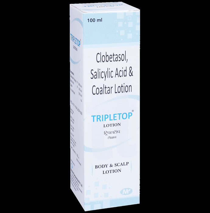 Tripletop Lotion has a combination of medicines that are used to treat psoriasis. It helps to provide relief from redness, itching and swelling. It removes dead skin cells and helps in softening the skin. Tripletop Lotion should be used in the dose and duration as advised by your doctor. Wash your hands before using this medicine. It is advised to check the label for directions before use. It is for external use only.Do not use this medicine more than the recommended dose. Inform your doctor if you have known allergies from this medicine. The common side effects of this medicine include dry skin, thinning of skin, burning, itching, irritation, and redness at the application site.If these side effects or any other symptoms which you think are because of this medicine persist for a longer duration, please consult your doctor. Inform your doctor if you are pregnant or are suffering from any other disease. This medicine is safe to use in breastfeeding mothers.