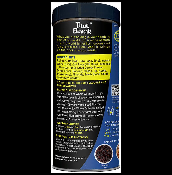 True Elements Whole Oatmeal acts as a source of 100% natural whole grains, protein and fiber rolled oats and can be eaten as a snack or a breakfast meal.This power-packed meal is rich in soluble fiber, so people tend to feel full more quickly after eating it than they do after consuming other foods. Feeling full can help an individual reduce their portion size and achieve their weight loss goals.